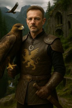 Wappen von Fo Passus mit dem Falken als Helmzier und dem Griffon als Wappentier der Familie Passus, dem doppelten Dreizack von Theostelos, sowie dem Phönix
