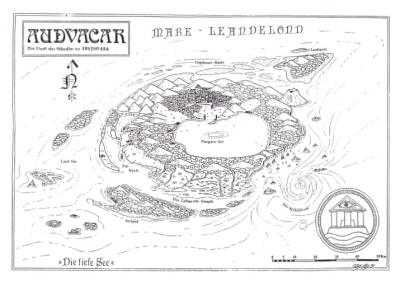 “… zu jener Zeit aber geschah es das der Phoenix inmitten des so friedlichen Erkenfara niederging um sich aufs neue zu verjüngen. Die Gewalten, die er entfesselte, barsten den Kontinent in vier annähernd gleichgroße Teile, die mit Urgewalt auseinandergesprengt, in Nord-Süd-Richtung ein Inselgewirr und in Südost-Richtung tiefe Kontinentalspalten, zwischen sich ließen. Im Zentrum aber blieben tiefste Meeresgräben zurück die sich wie ein breiter Ring um jene Stelle zogen, an dem der Phoenix die Katastrophe herbeigeführt hatte. Hier erhob sich seit dem ein riesiger Atollkrater mit einem alles überragenden Vulkanschlund als Zentrum einer Region schlimmster Unwetter und wilder Stürme, Mare Leandelond (die tiefe See).
