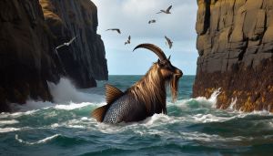 Die Wasserziege (Capricornus) ist eine seltene Kreatur, die ausschließlich in der Küstenregion von Carmoth vorkommt. Diese beeindruckenden Wesen sind bekannt für ihre Fähigkeiten, die es ihnen ermöglichen, sowohl an den rauen Steilklippen nach Nahrung zu suchen. Die Wasserziege hat eine robuste, zähe Haut am Oberkörper und Fischschuppen am Unterkörper, der in einem Fischschwanz mit Flossen endet. Sie besitzt kräftige Vorderbeine mit scharfen Hufen, die ihr einen festen Halt auf den Felsen auch bei starkem Seegang geben.