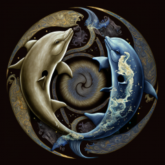 Zwei Delphine um einen Mahlstrom als Symbol für Kasson, den Meeresgott