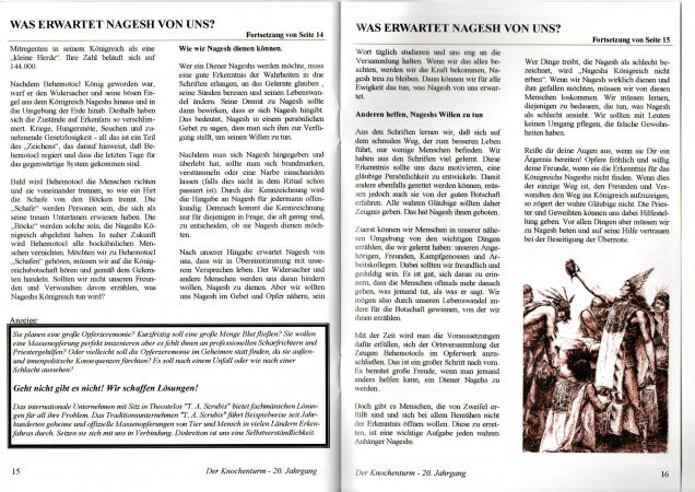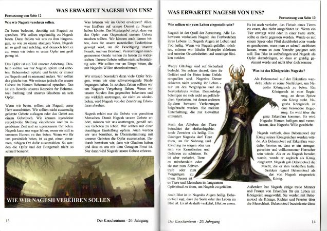 Der Knochenturm ist eine Publikation der Nagesh-Anhänger. Hier werden wertvolle Tipps für die gottgefällige Opferung gegeben, neue Anhänger gesucht und gefunden, Prophezeiungen geteilt sowie unterschwellige Drohungen gegen Ungläubige und Sünder ausgestoßen. Also ist hier alles wie bei anderen Religionen auch.