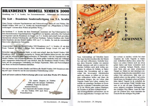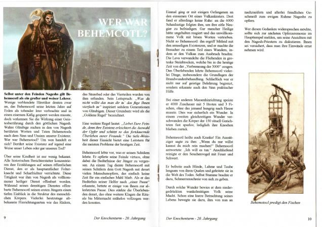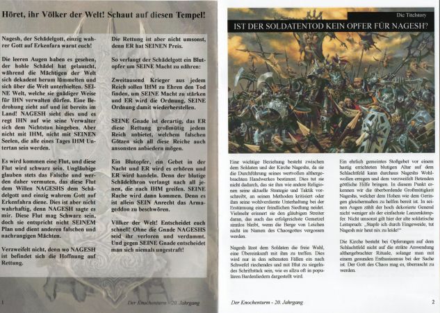 Die Ausgabe zum zwanzigsten Erkenfara-Treffen enthält darüber hinaus auch ein Geleitwort von Nagesh höchstpersönlich, welches er auf Anregung der Elementare verfasste. Der Knochenturm verkündet also das Wort des Gottes Nagesh nicht nur im übertragenen Sinne!