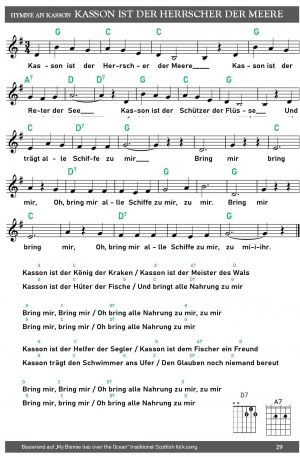 [verse 1] G D Kasson ist der Herrscher der Meere Em D Em Kasson ist der Retter der See G D Kasson ist der Schützer der Flüsse Em D Em Und trägt alle Schiffe zu mir [chorus] G D Bring mir, Bring mir D C Em Oh bring alle Schiffe zu mir, zu mir C G Bring mir, bring mir D C Em Oh bring alle Schiffe zu mir [verse 2] Kasson ist der König der Kraken Kasson ist der Meister des Wals Kasson ist der Hüter der Fische Und bringt alle Nahrung zu mir [chorus] Bring mir, Bring mir Oh bring alle Nahrung zu mir, zu mir Bring mir, bring mir Oh bring alle Nahrung zu mir [verse 3] Kasson ist der Helfer der Segler Kasson ist dem Fischer ein Freund Kasson trägt den Schwimmer ans Ufer Den Glauben noch niemand bereut [chorus] Bring mir, Bring mir Oh bring den Glauben zu mir, zu mir Bring mir, bring mir Oh bring den Glauben zu mir