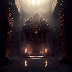 Beim Betreten des Tempels wird man von einem schwach beleuchteten Innenraum empfangen, der von flackernden Fackeln und Kerzen erhellt wird. Die Atmosphäre ist schwer vom Duft des Weihrauchs, der die mystische Stimmung noch verstärkt. Die Haupthalle ist groß und höhlenartig, mit hohen Decken und imposanten Säulen, die mit Schlangenmotiven verziert sind. Schatten tanzen und winden sich an den Wänden entlang, was die unheimliche Atmosphäre des Tempels noch verstärkt.