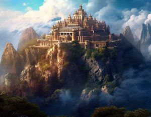 Wie das Kloster über den Bergen thront Wieda, die furchterregende Göttin der Rache und der unerfüllten Gier, hoch über den düsteren Abgründen menschlicher Emotionen. Mit einem Blick, der von glühender Wut durchdrungen ist, verkörpert Wieda die unbezähmbare und zerstörerische Kraft der Rache. Der Eingang zum Kloster ist durch eine gewaltige steinernen Treppe entlang einer eine Schlucht zu erreichen. Die Treppe führt zu einem massiven Tor, das mit den Symbolen der Göttin Wieda geschmückt ist - einem glühenden Schwert und einer goldenen Schale.